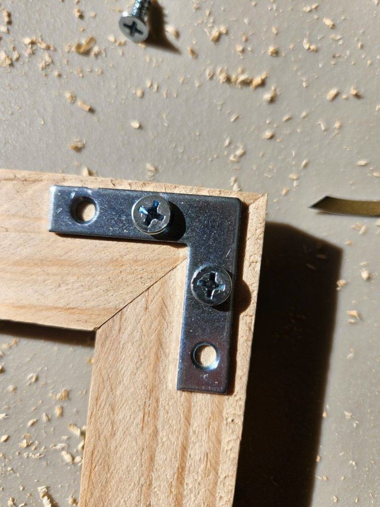 Once the glue has dried, add extra support with the L-brackets. Make sure to use short screws (½” flathead screws worked for us) so they don’t poke through the front of the frame.