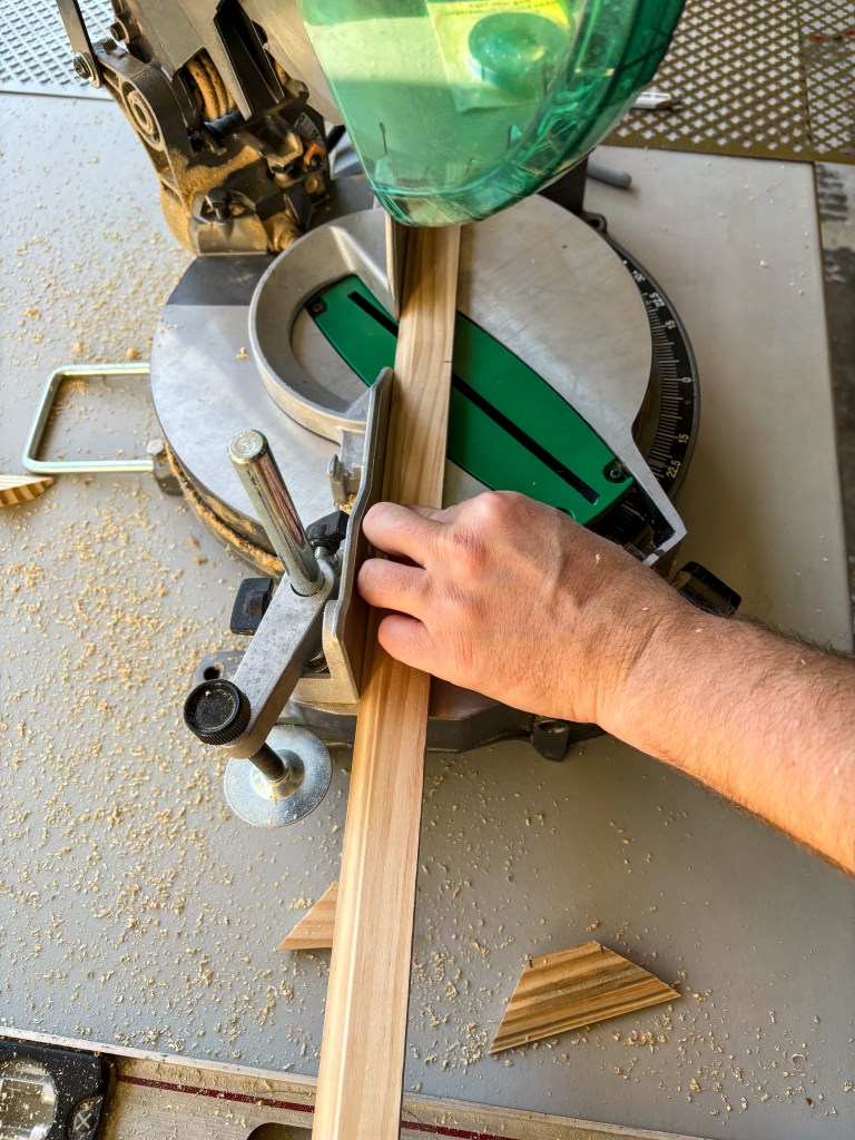 For our cover, we needed a finished size of 19”x23”. Using that measurement, we cut the moulding accordingly. When cutting the moulding, make sure to cut at a 45-degree angle for a perfect corner fit. Double-check the direction of the angle cuts to ensure all the pieces fit together properly (we learned this the hard way ).