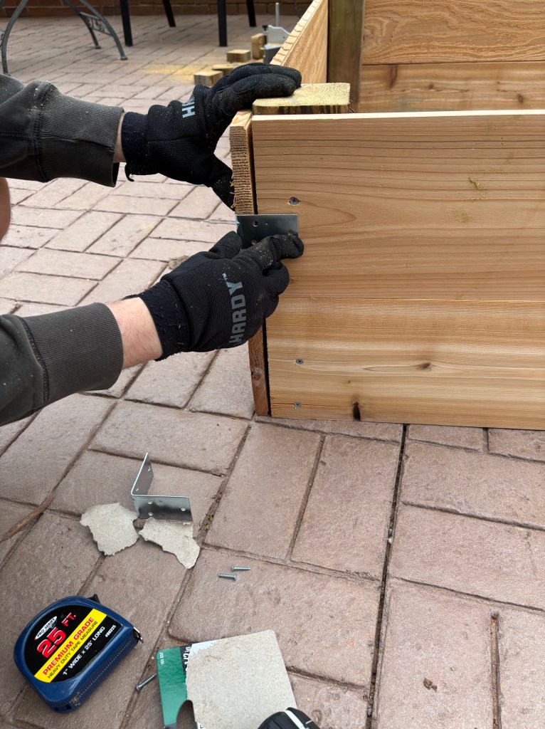 Once the boards are flush, attach your metal corner brackets to strengthen each corner. Add the flat brackets to the long sides for extra stability. - Lay a weed barrier.
