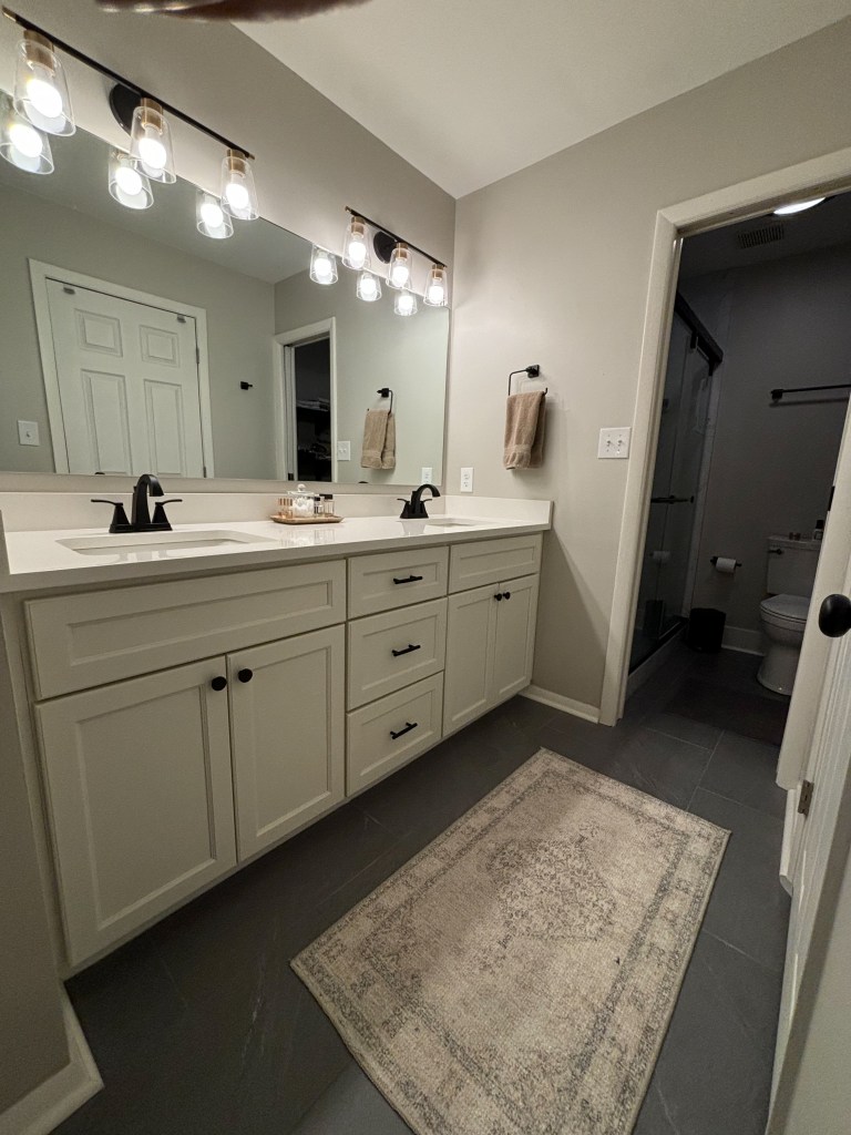 This one might be a little controversial, but I really don’t love the black hardware in our primary bathroom. At first, it looked sleek and modern—but it’s so hard to keep clean. Water spots, toothpaste splatter, and general grime show up constantly. And if I’m being honest, I’m kind of over the black-and-white farmhouse vibe. The upside: hardware is one of the easiest things to swap out. I’m leaning toward brushed nickel or even a soft brass next time around.