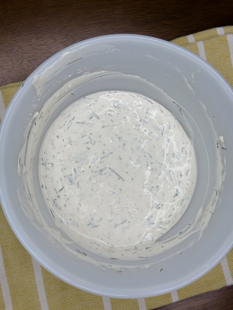 - In a bowl, combine mayo, sour cream, dill, Parmesan, lemon juice, grated onion, garlic, Worcestershire sauce, salt, and pepper. Mix until smooth.