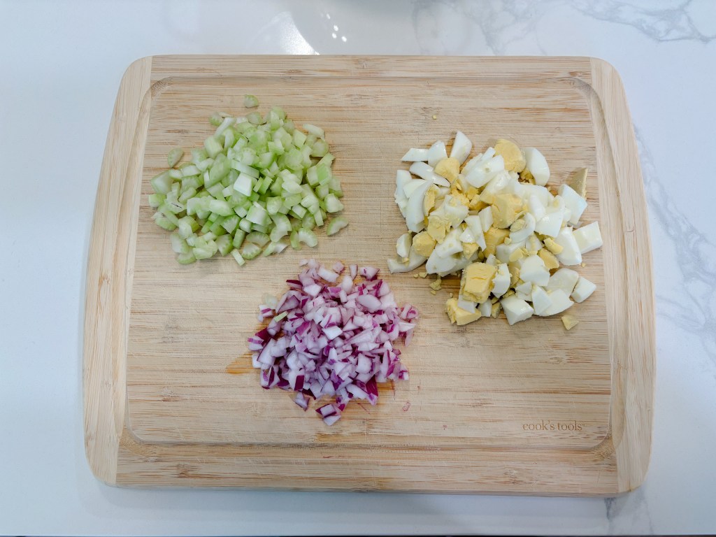 - In a large bowl, combine the tuna, celery, red onion, and chopped hardboiled eggs.