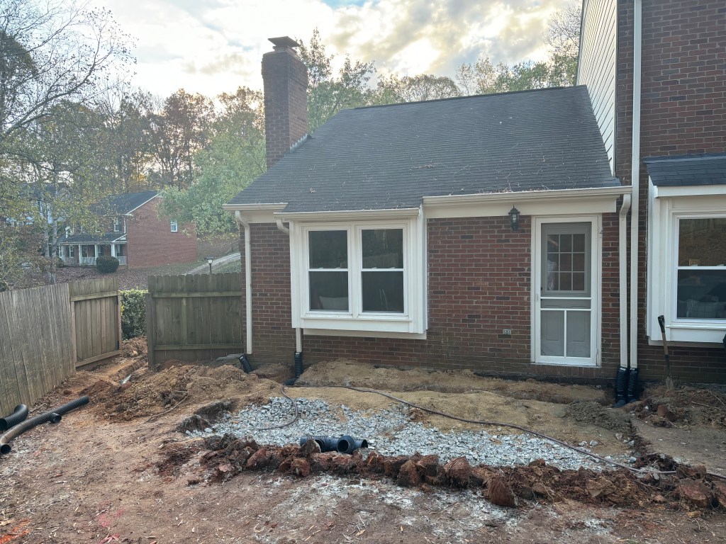 Next, we dug over 100 feet of trenches by hand to install new drainage pipes for the downspouts, since the new patio would cover part of the original drainage path. It was exhausting, but we made it work!