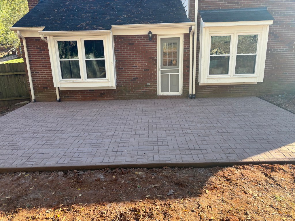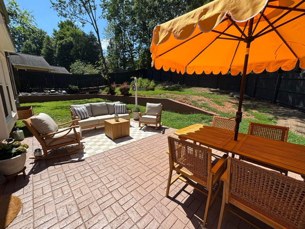 We expanded the patio to 15’x30’ and chose stamped concrete for an elevated look that fit within our budget. We hired pros to pour and stamp it, then sealed it ourselves after letting it cure for about 30 days. Tip: if you’re sealing concrete—buy more sealant than you think you’ll need!