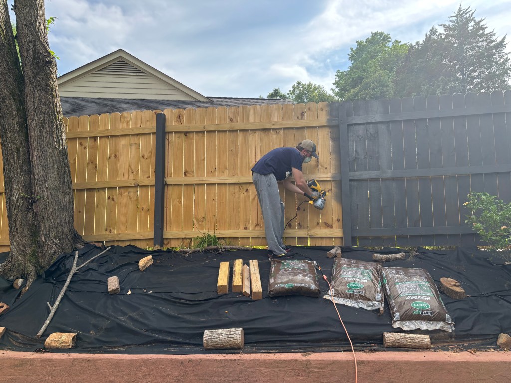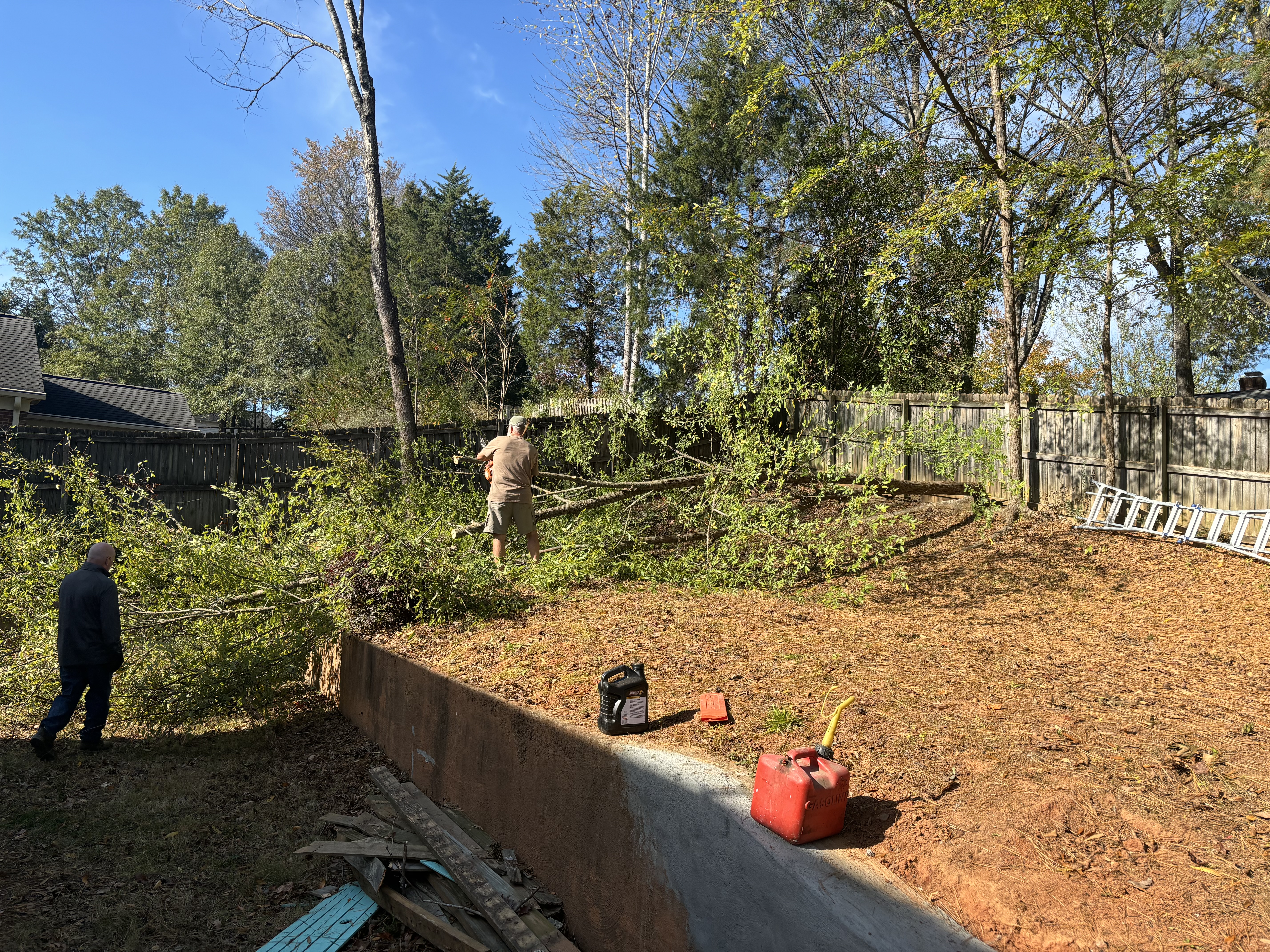The first step? Removing trees that were way too close to the house. The biggest offender was a massive oak right on our property line with the neighbors. It constantly dropped leaves and debris and was starting to feel a little too close for comfort—so down it came. We hired professionals for that one (smart move), and thankfully the only casualty was a small section of our retaining wall. My dad and Ryan handled a few of the smaller trees, and yes—it was very entertaining to watch!